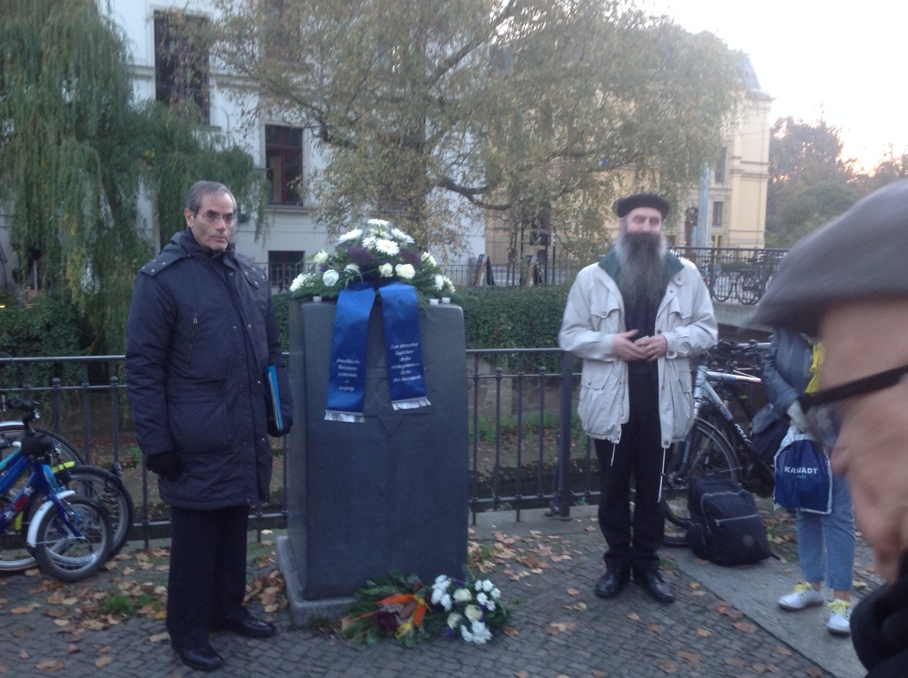 On Kristallnacht, I was privileged to give three speeches (two in German thanks to Ursula’s translation and pronunciation drilling) in Leipzig, the city where my late father was born, grew up, and was arrested on that horrible night, November 9, 1938. My three Kristallnacht addresses in English are also on my web page blog.